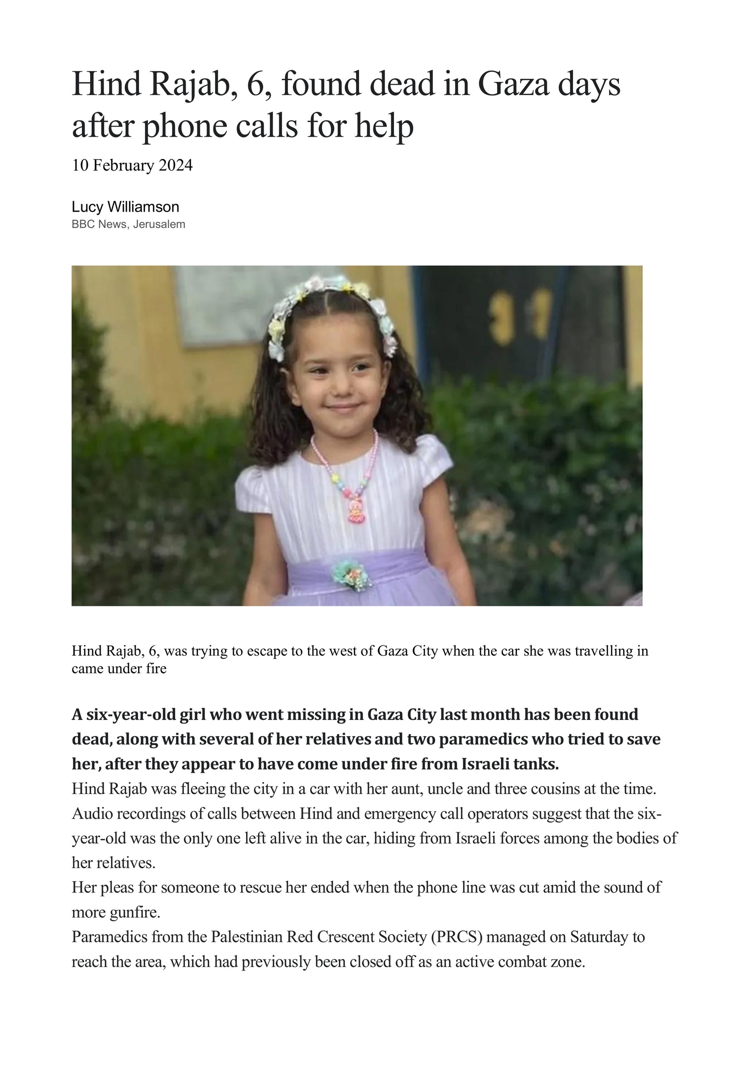 HIND RAJAB, 6, FOUND DEAD IN GAZA: BBC 10 FEBRUARY 2024 -