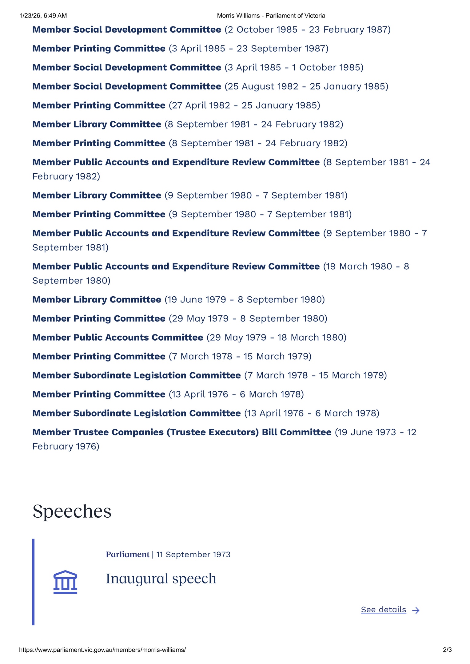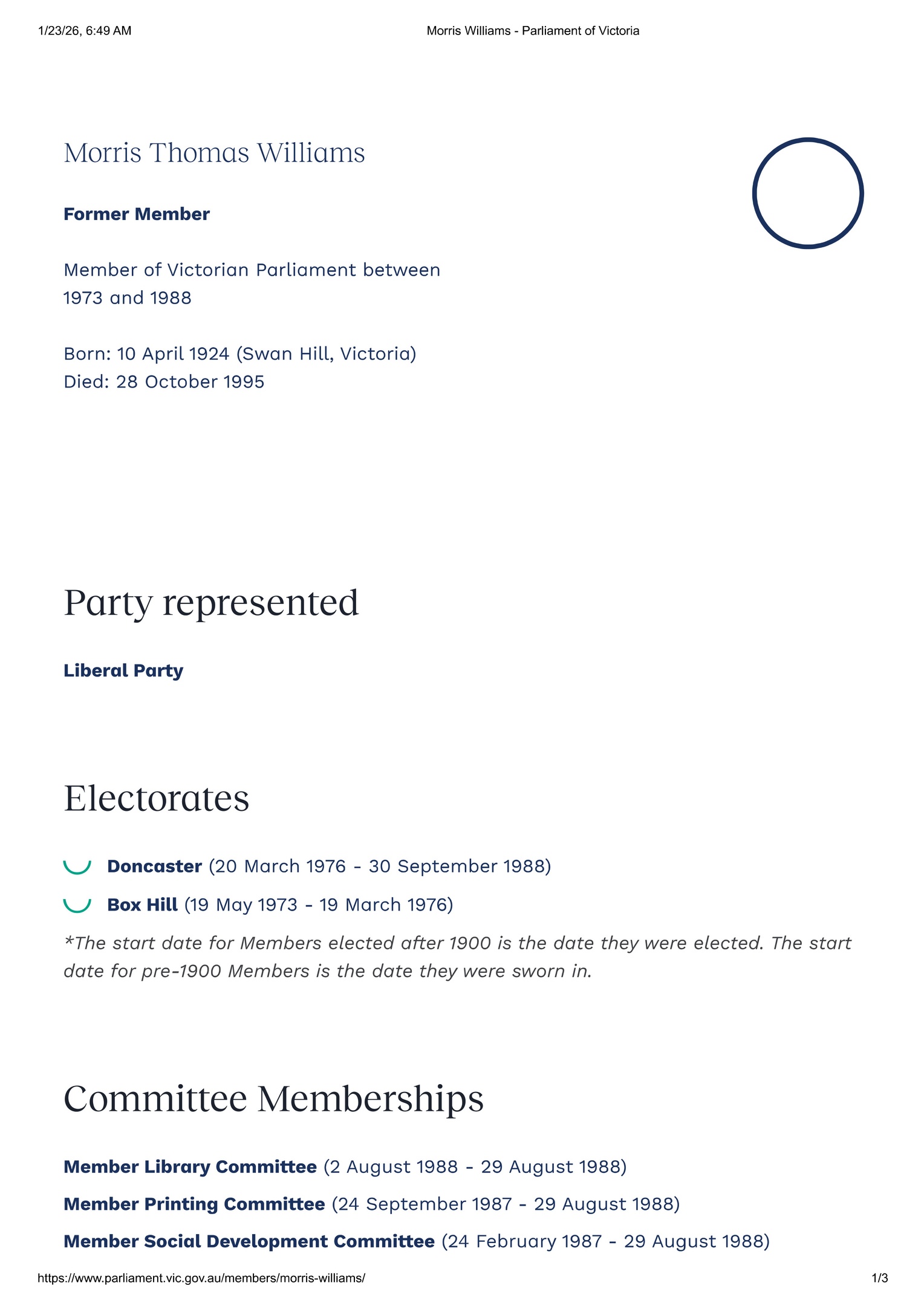 MORRIS WILLIAMS MP STATE PARLIAMENT OF VICTORIA 1973-1988 - 1