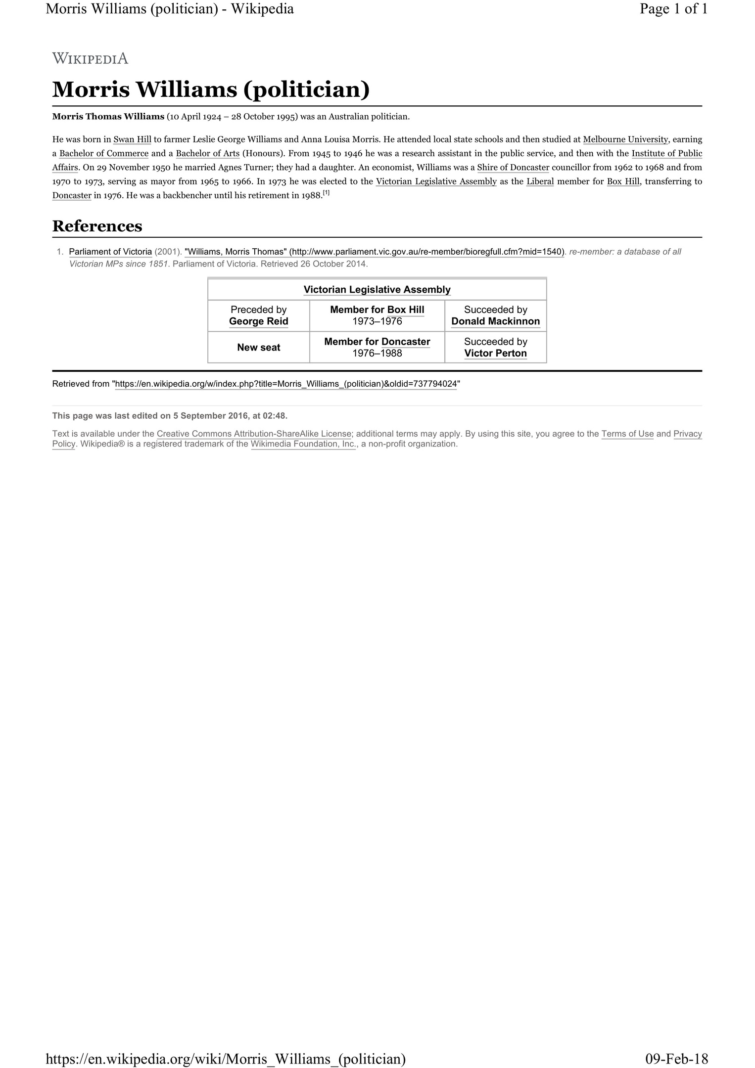 MORRIS WILLIAMS MP STATE PARLIAMENT OF VICTORIA 1973-1988